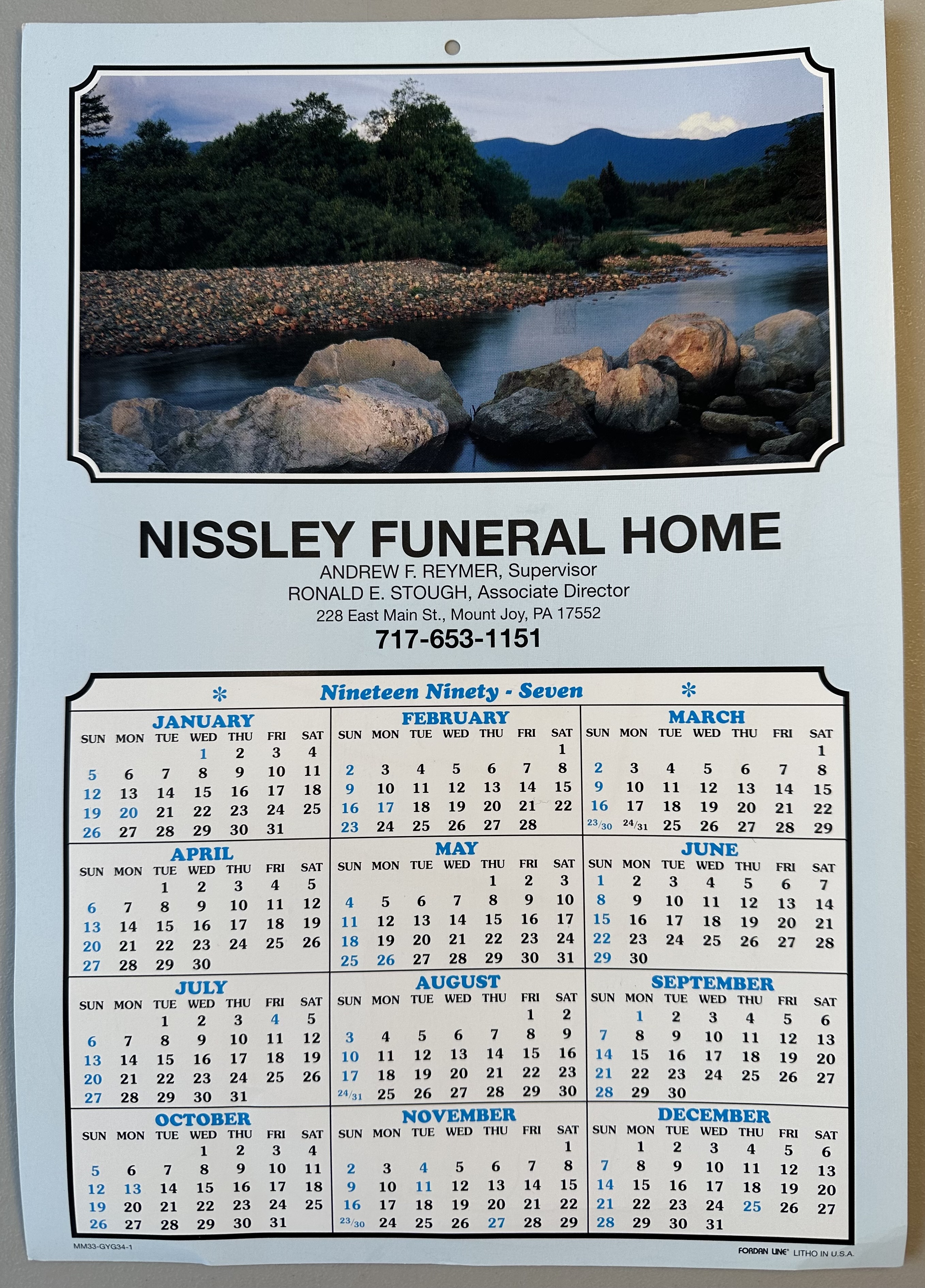 “Nissley Funeral Home calendar, 1997,” MJAHS Online Inventory, accessed October 14, 2025, https://www.mountjoyhistory.com/inventory/items/show/11929.
