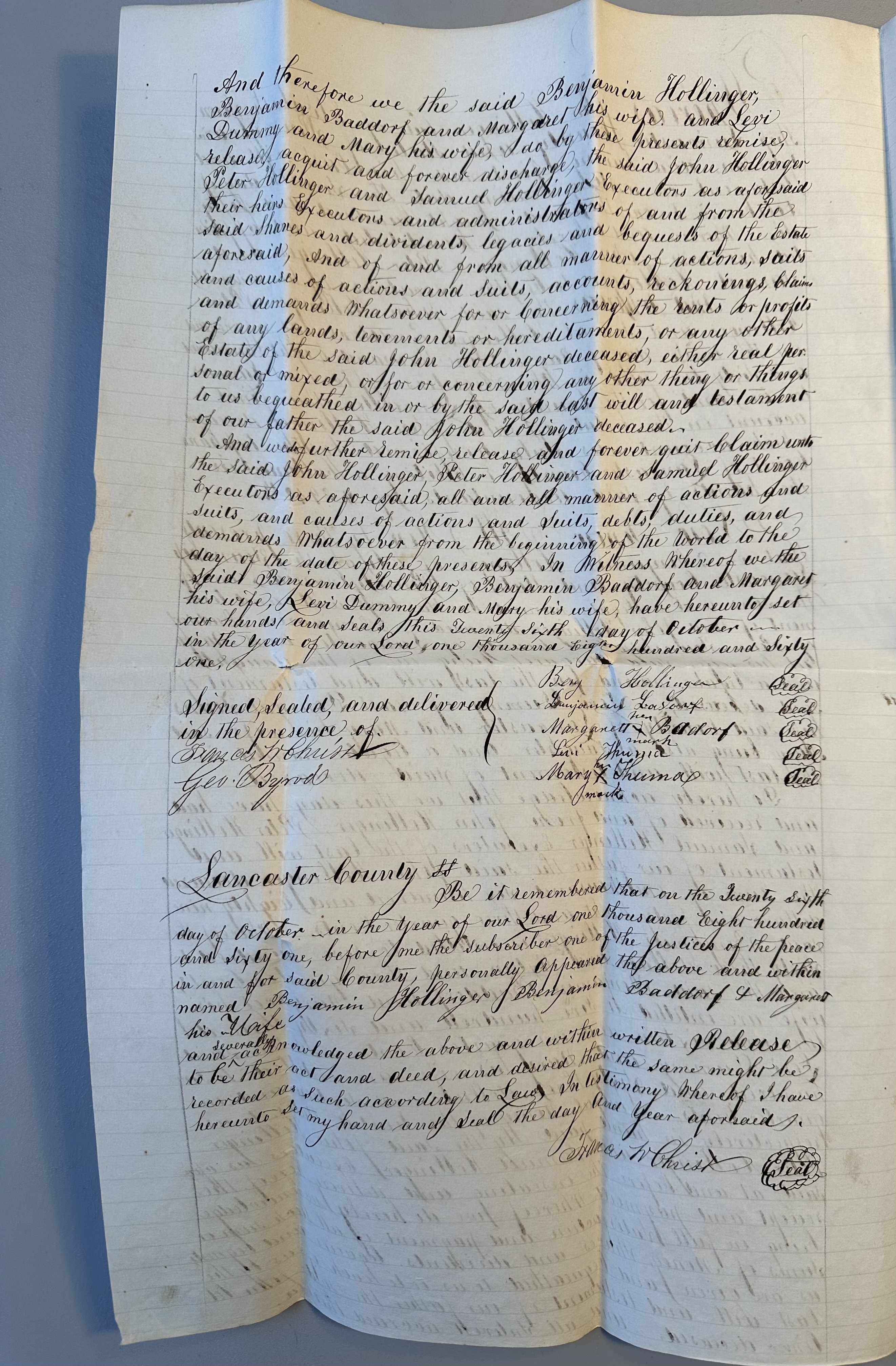 “John Hollinger last will and testament, distribution of funds, October 17, 1856,” MJAHS Online Inventory, accessed October 15, 2025, https://www.mountjoyhistory.com/inventory/items/show/11933.