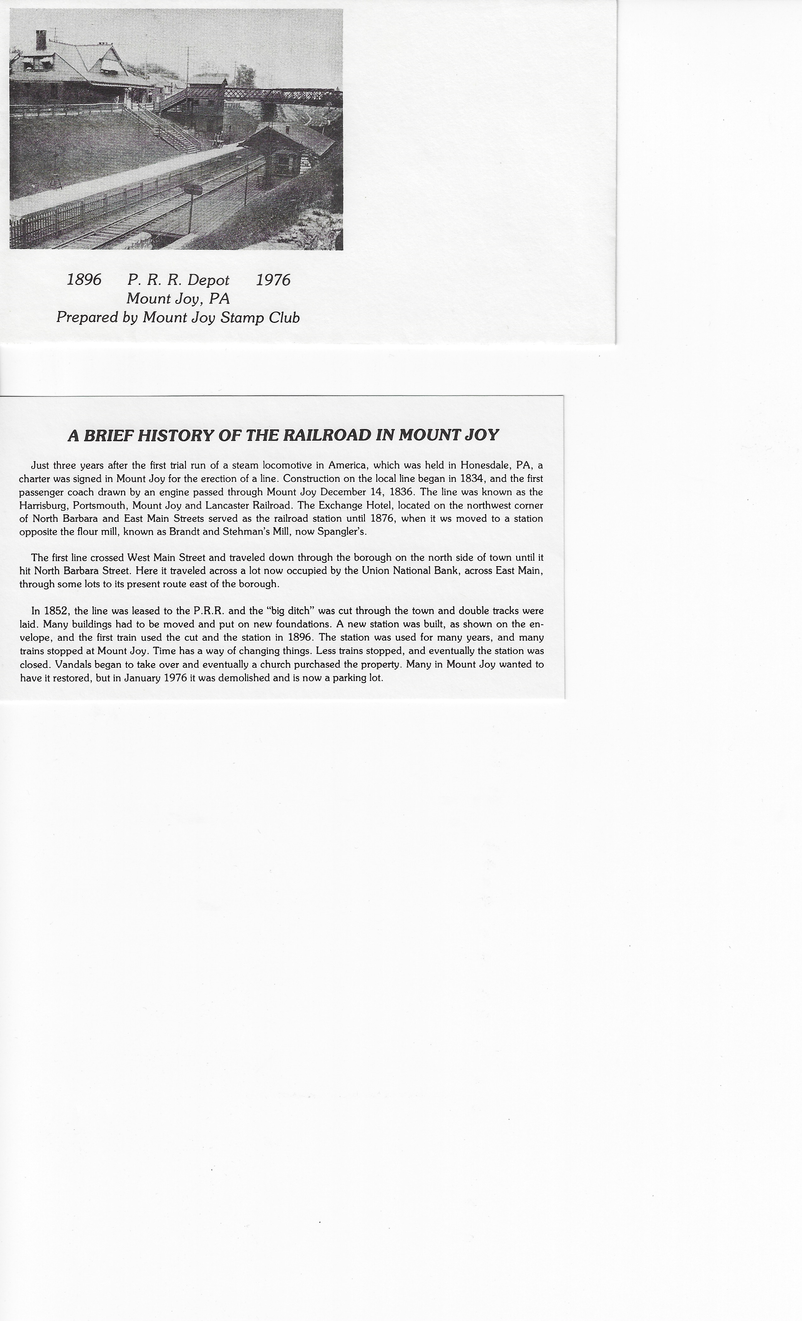 Mount Joy Stamp Club, “P.R.R. Depot, with history of Railroad depot, 80th Anniversary, 1896-1976,” MJAHS Online Inventory, accessed October 16, 2025, https://www.mountjoyhistory.com/inventory/items/show/11937.