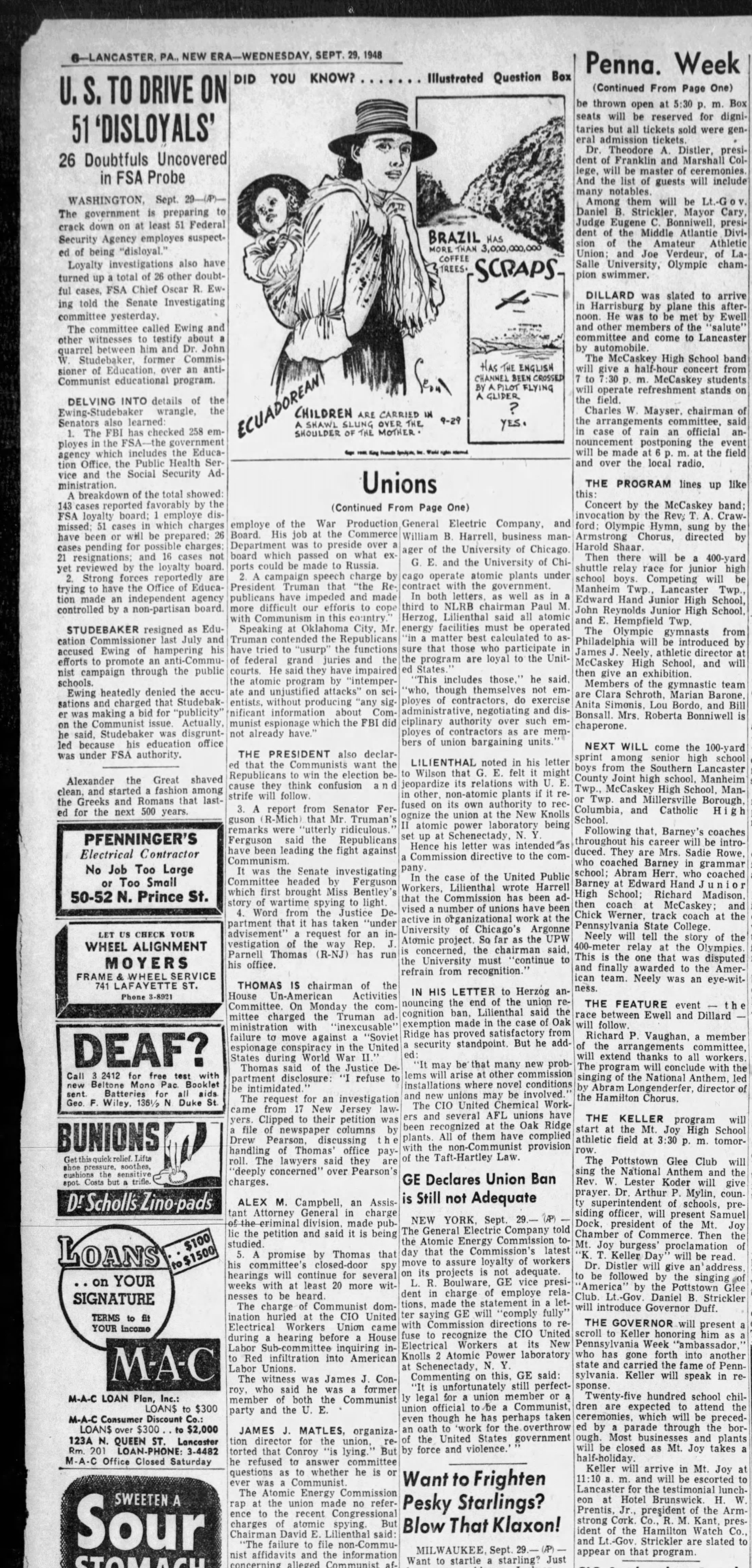 KT Keller Newspaper Article "PA. Week", Sep 29, 1948, Lancaster New Era