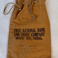 “1st National Bank and Trust Co., Tan Burlap Drawstring Bank Bag,” MJAHS Online Inventory, accessed March 7, 2026, https://www.mountjoyhistory.com/inventory/items/show/12012.