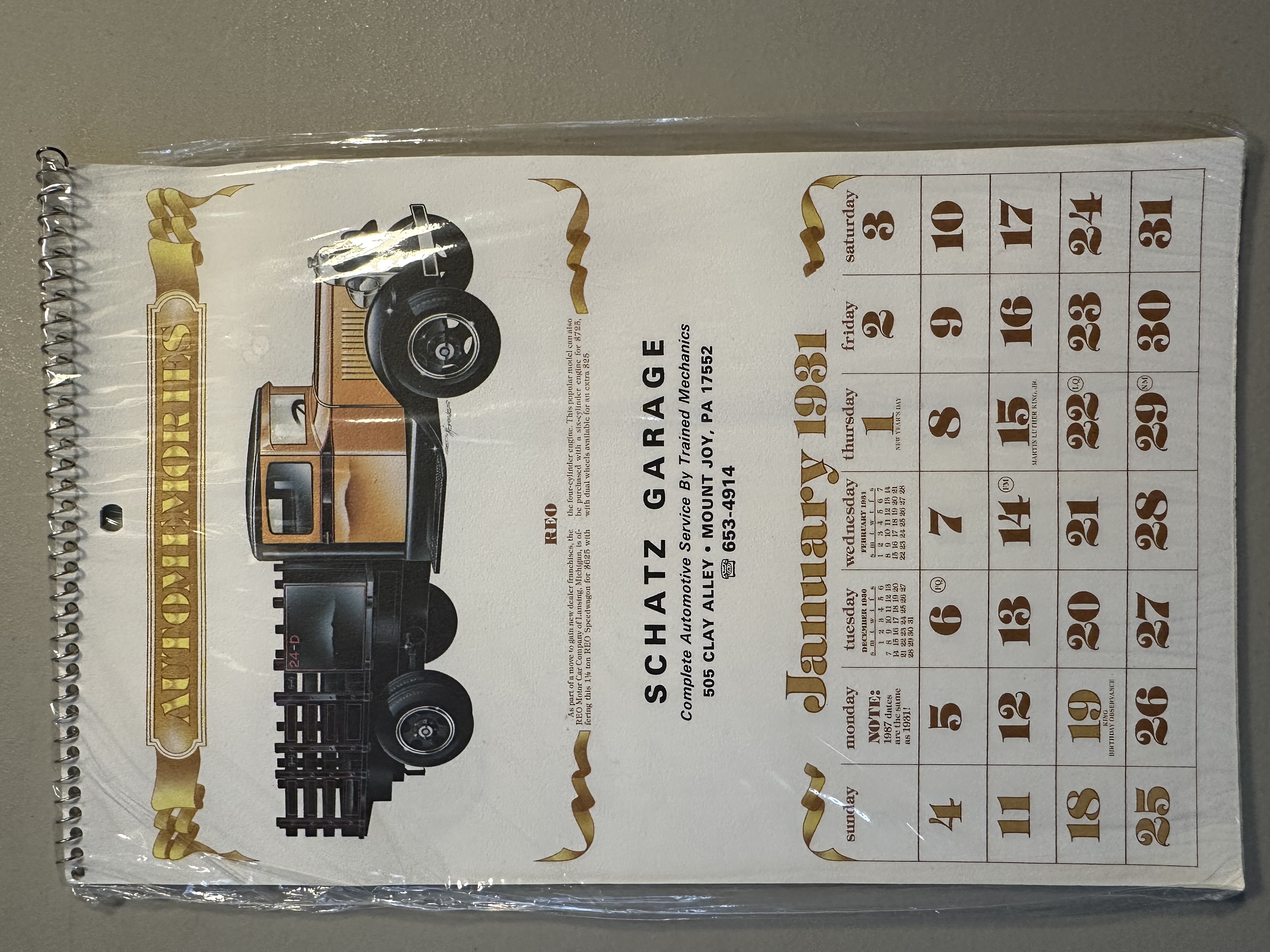“Schatz Garage Automemories 1931 Calendar (from 1987),” MJAHS Online Inventory, accessed October 14, 2025, https://www.mountjoyhistory.com/inventory/items/show/12076.