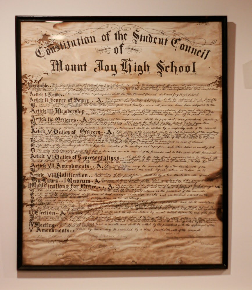 “Mount Joy High School Constitution of the Student Council - framed,” MJAHS Online Inventory, accessed October 16, 2025, https://www.mountjoyhistory.com/inventory/items/show/12088.