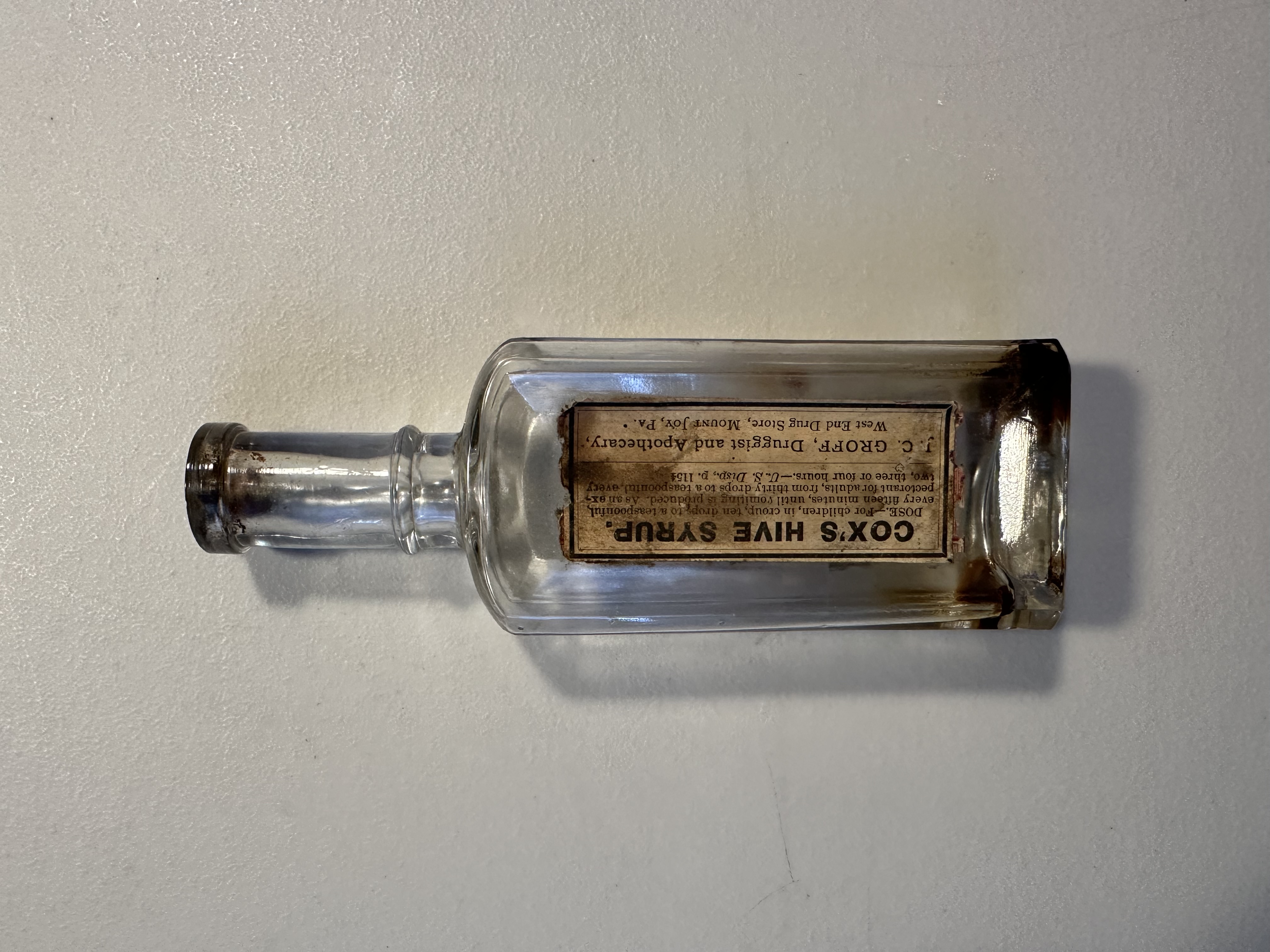 Cox's Hive Syrup bottle from J. C. Groff, Druggist and Apothecary from West End Drug Store, Mount Joy