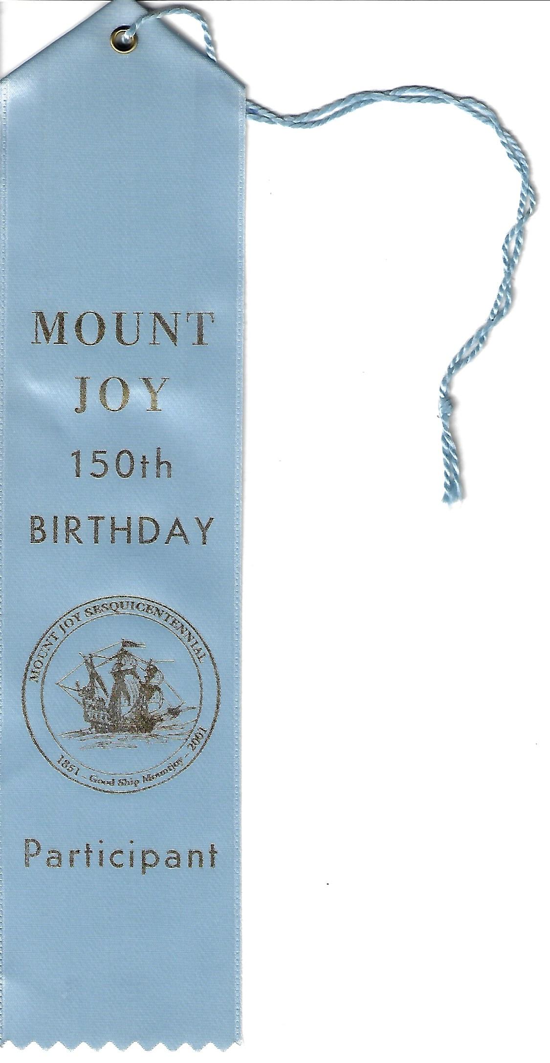 “Mount Joy 150th birthday ribbon, participant,” MJAHS Online Inventory, accessed October 15, 2025, https://www.mountjoyhistory.com/inventory/items/show/12185.