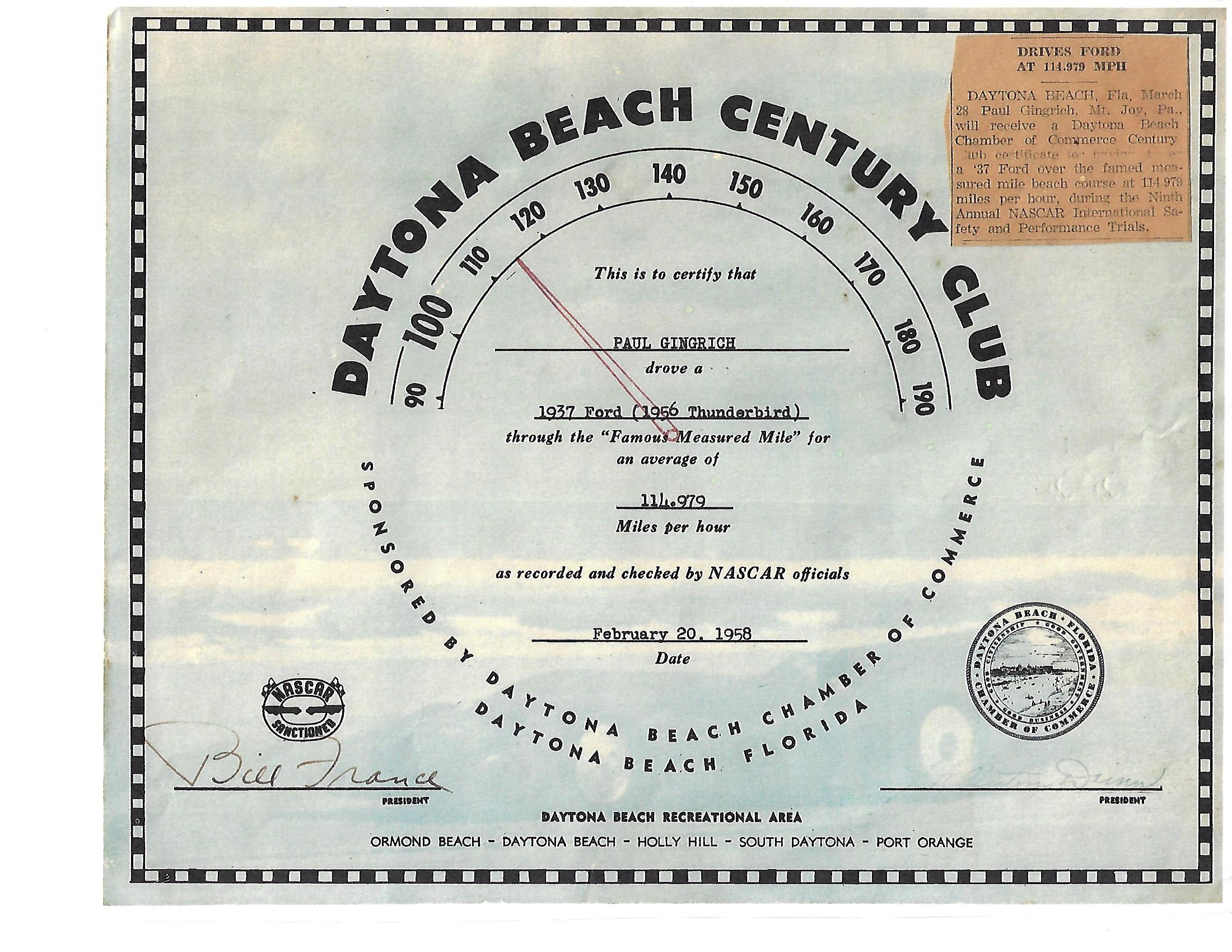 Paul Gingrich drove a 1937 Ford (1956 Thunderbird) through the "Famous Measured Mile" of Daytona Beach and averaged 114.979 miles per hour.