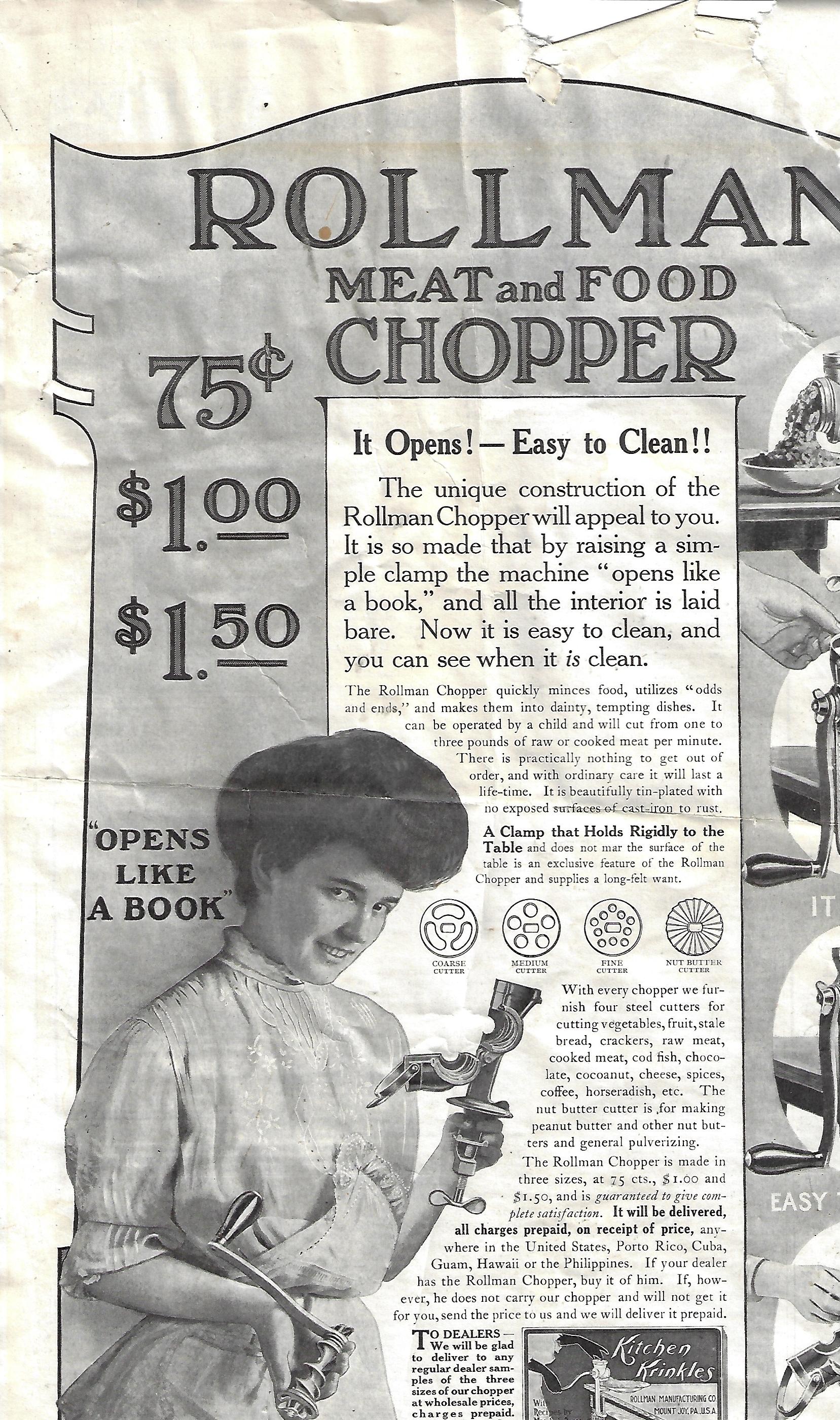 “Rollman Meat and Food Chopper Magazine Advertisement,” MJAHS Online Inventory, accessed October 15, 2025, https://www.mountjoyhistory.com/inventory/items/show/12415.