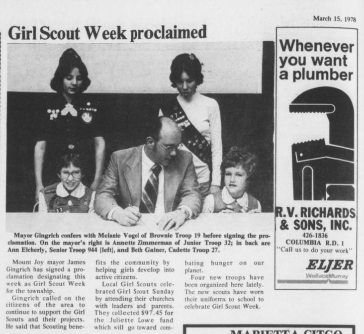"Girl Scout Week proclaimed" Susquehanna Times Newspaper Article from Mar 15, 1978, Mount Joy Mayor James Gingrich dedicates this week as Girl Scout Week. Includes photograph of Gingrich with Melanie Vogel Brownie Troup 19, Annette Zimmerman Junior Troup 32, Anne Eicherley Senior Troup 944 and Beth Gainer Cadet Troup 27.