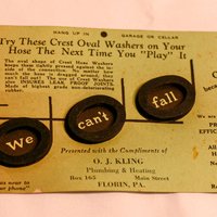 “O. J. Kling Plumbing & Heating Oval Washer Advertisement,” MJAHS Online Inventory, accessed November 27, 2025, https://www.mountjoyhistory.com/inventory/items/show/12827.