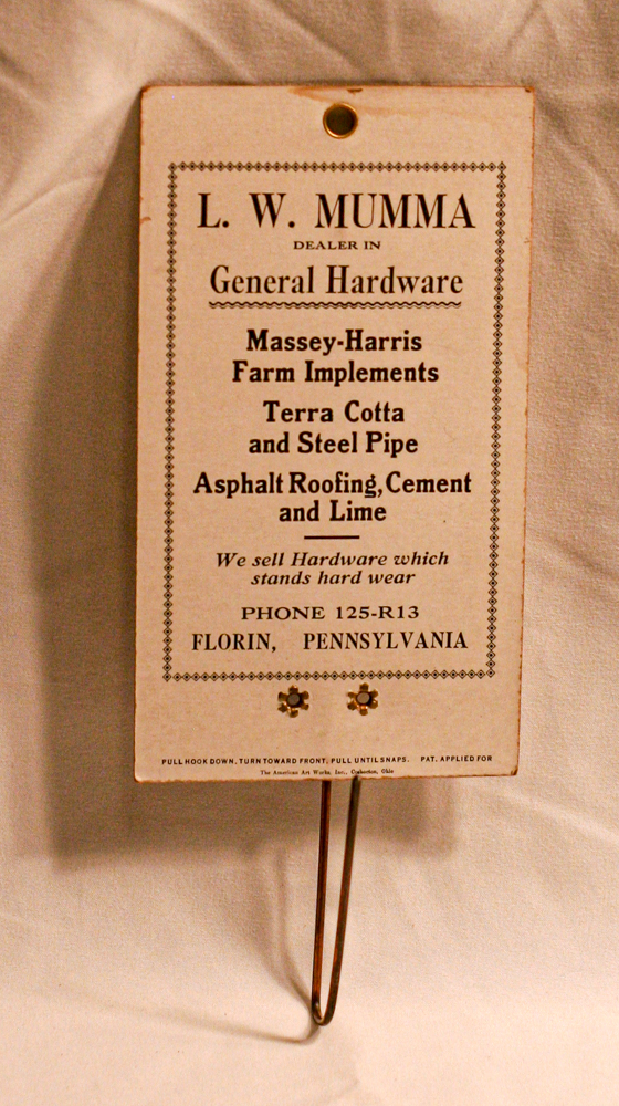 The American Art Works, Inc., “L. W. Mumma Paper Holder Hook,” MJAHS Online Inventory, accessed November 27, 2025, https://www.mountjoyhistory.com/inventory/items/show/12830.