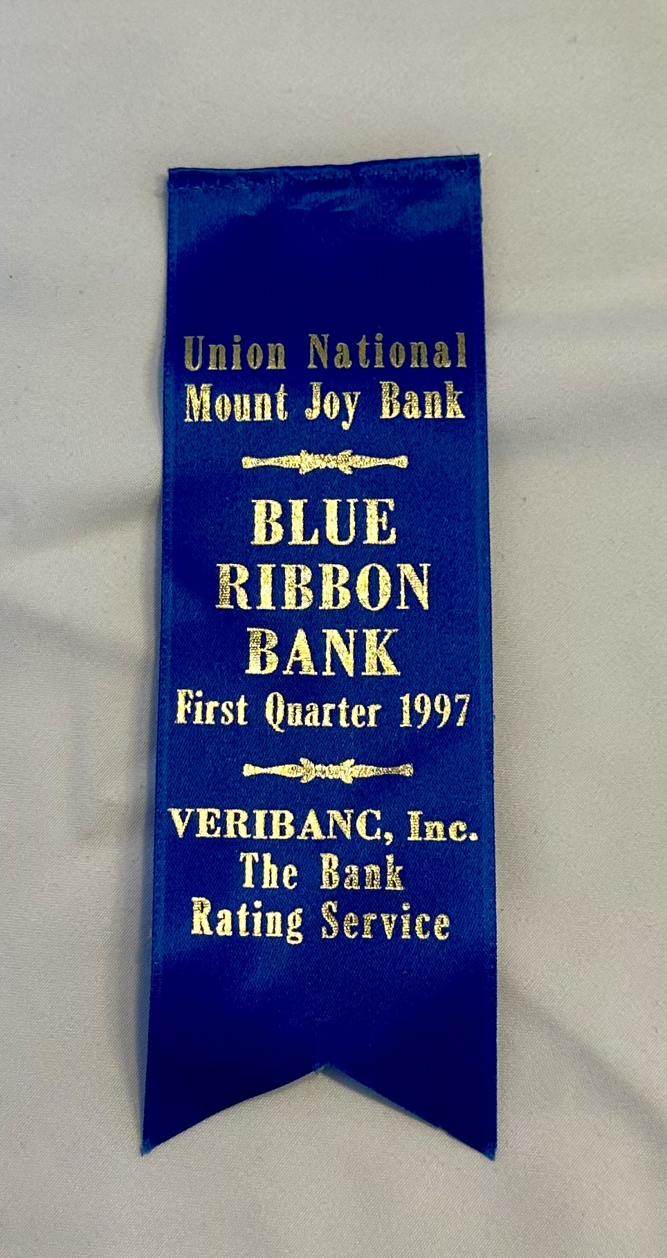“Union National Mount Joy Bank "Blue Ribbon Bank" 1st quarter, 1997, ribbon,” MJAHS Online Inventory, accessed November 28, 2025, https://www.mountjoyhistory.com/inventory/items/show/12853.
