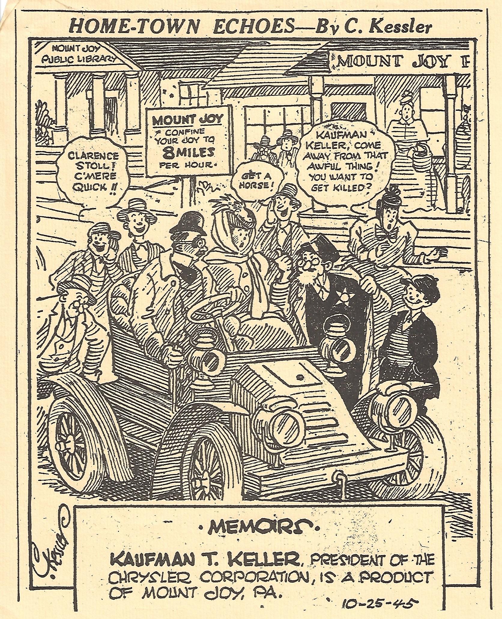 C. Kessler, cartoon, Kaufman T. Keller, news article, October 2, 1945, Clarence, Stoll, Mount Joy Public Library, Chrysler Corporation