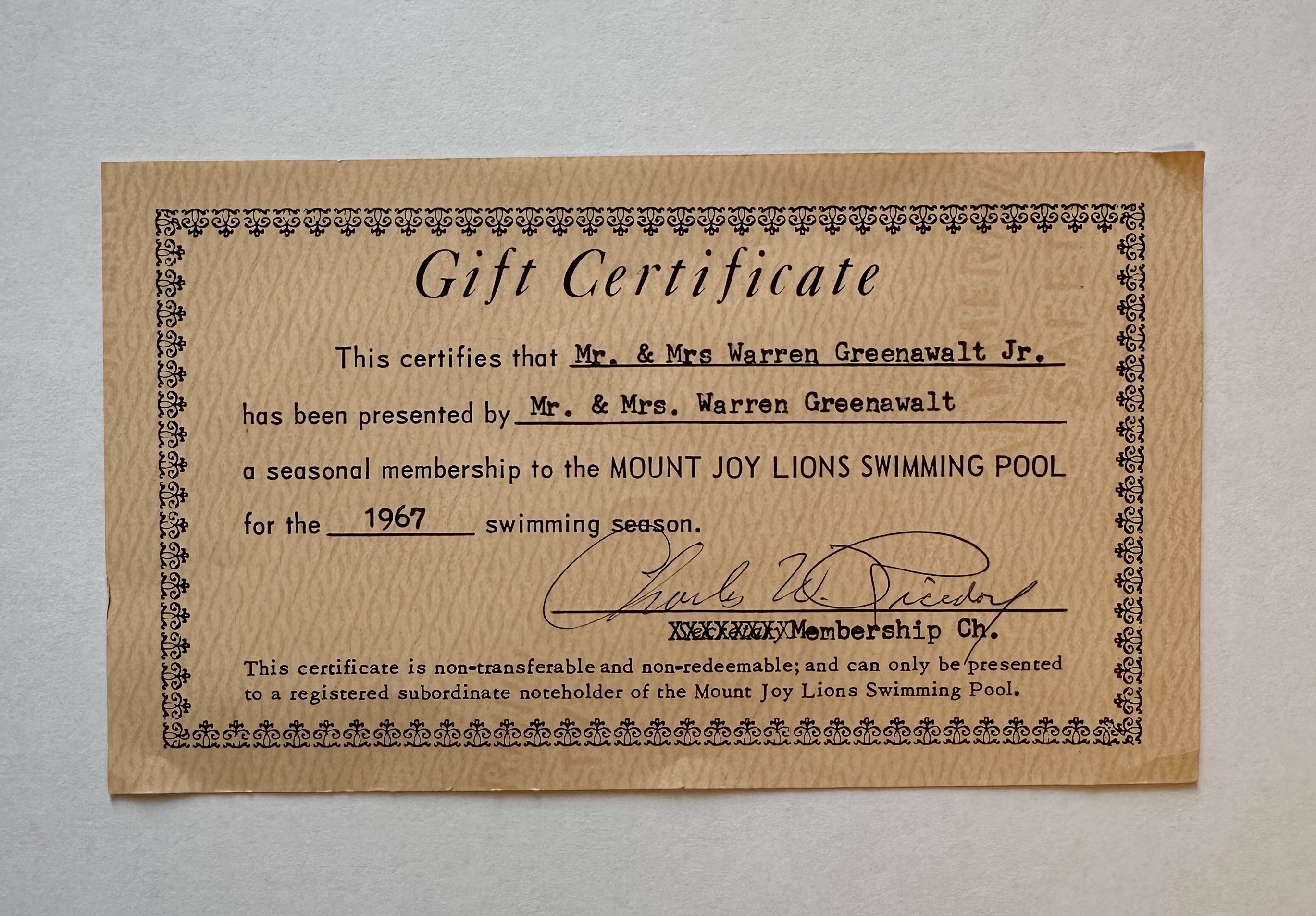 Gift certificate, membership, Mount Joy Lions Pool, pool, Warren Greenawalt Jr., 1967